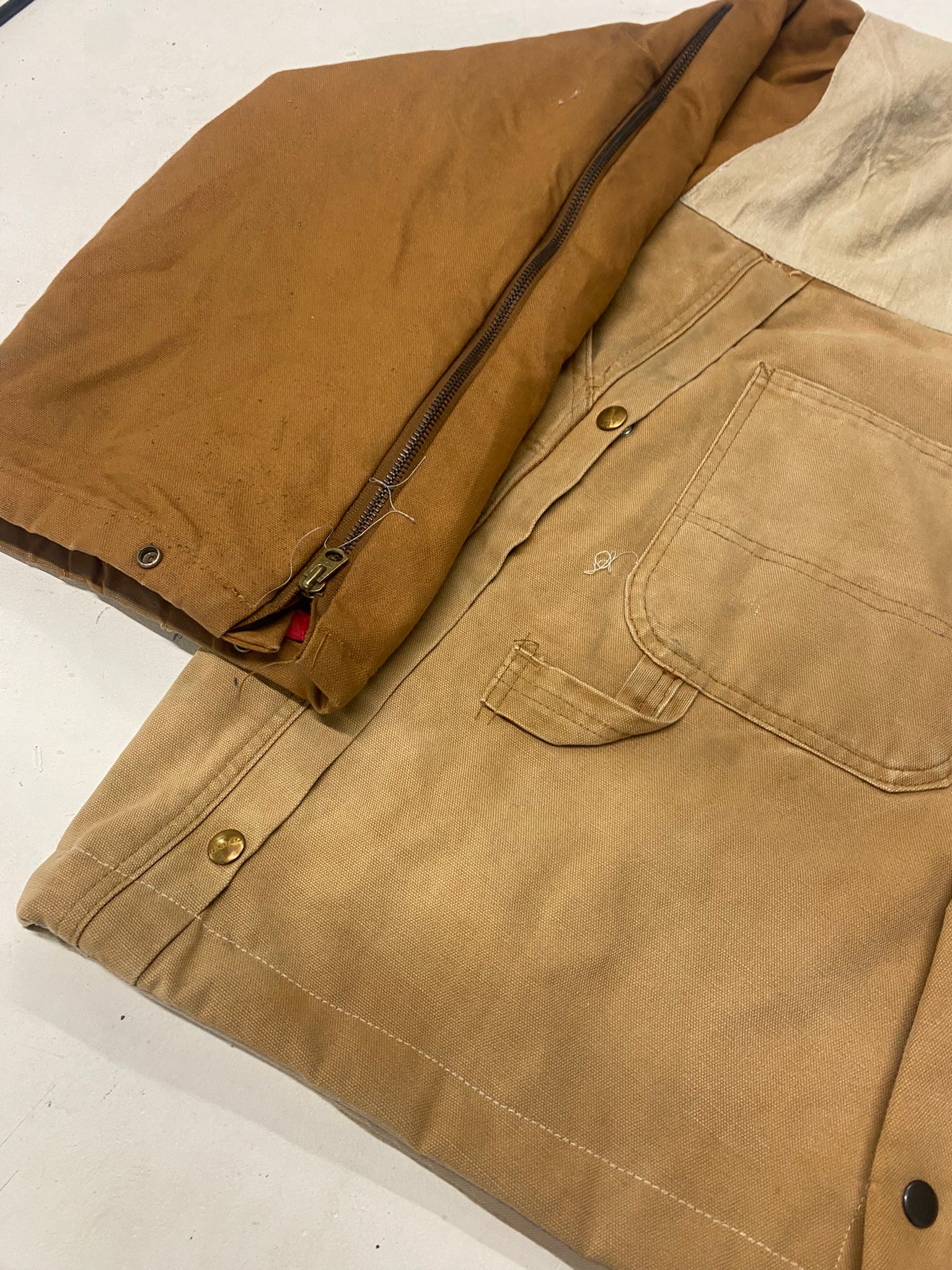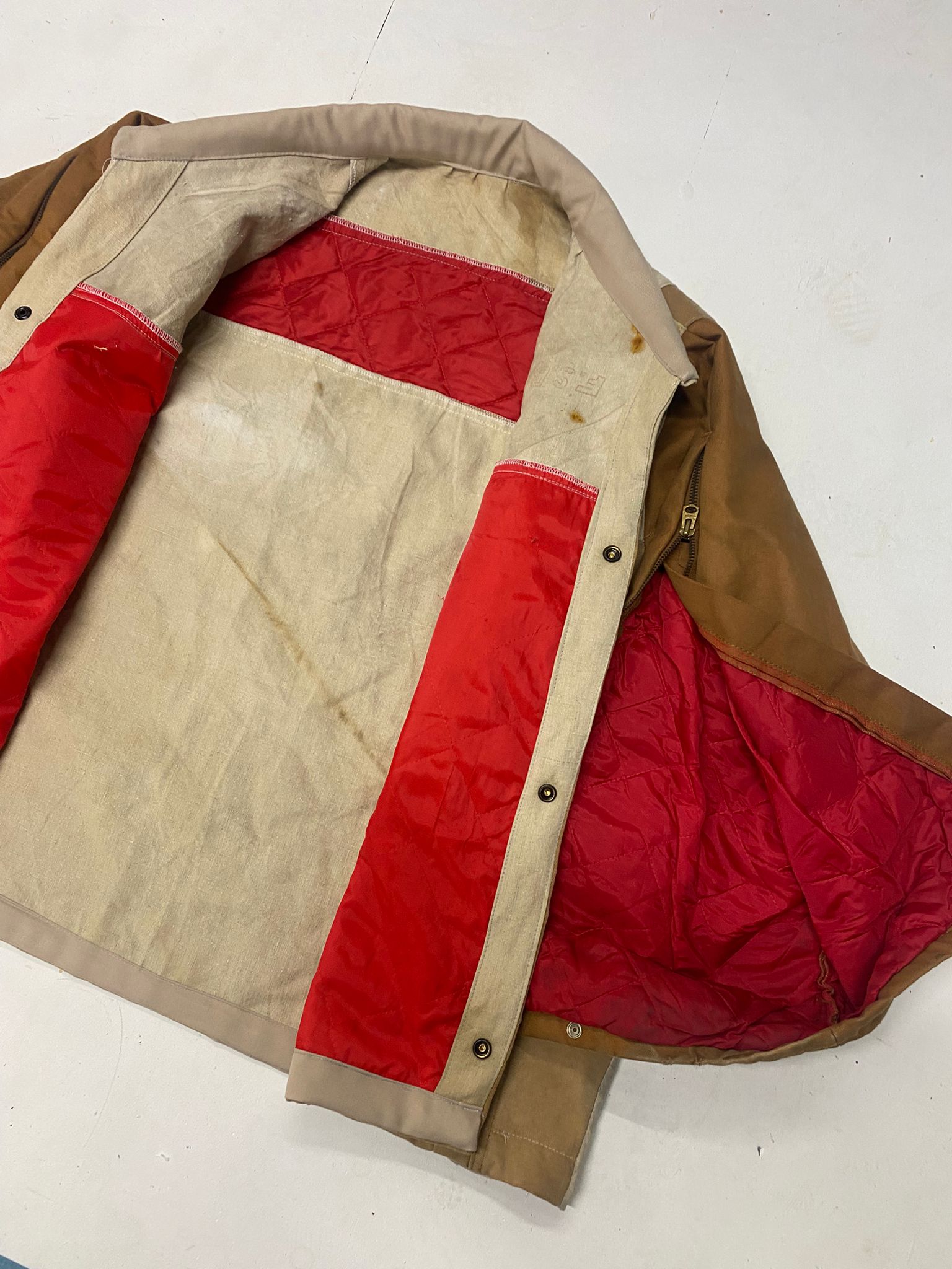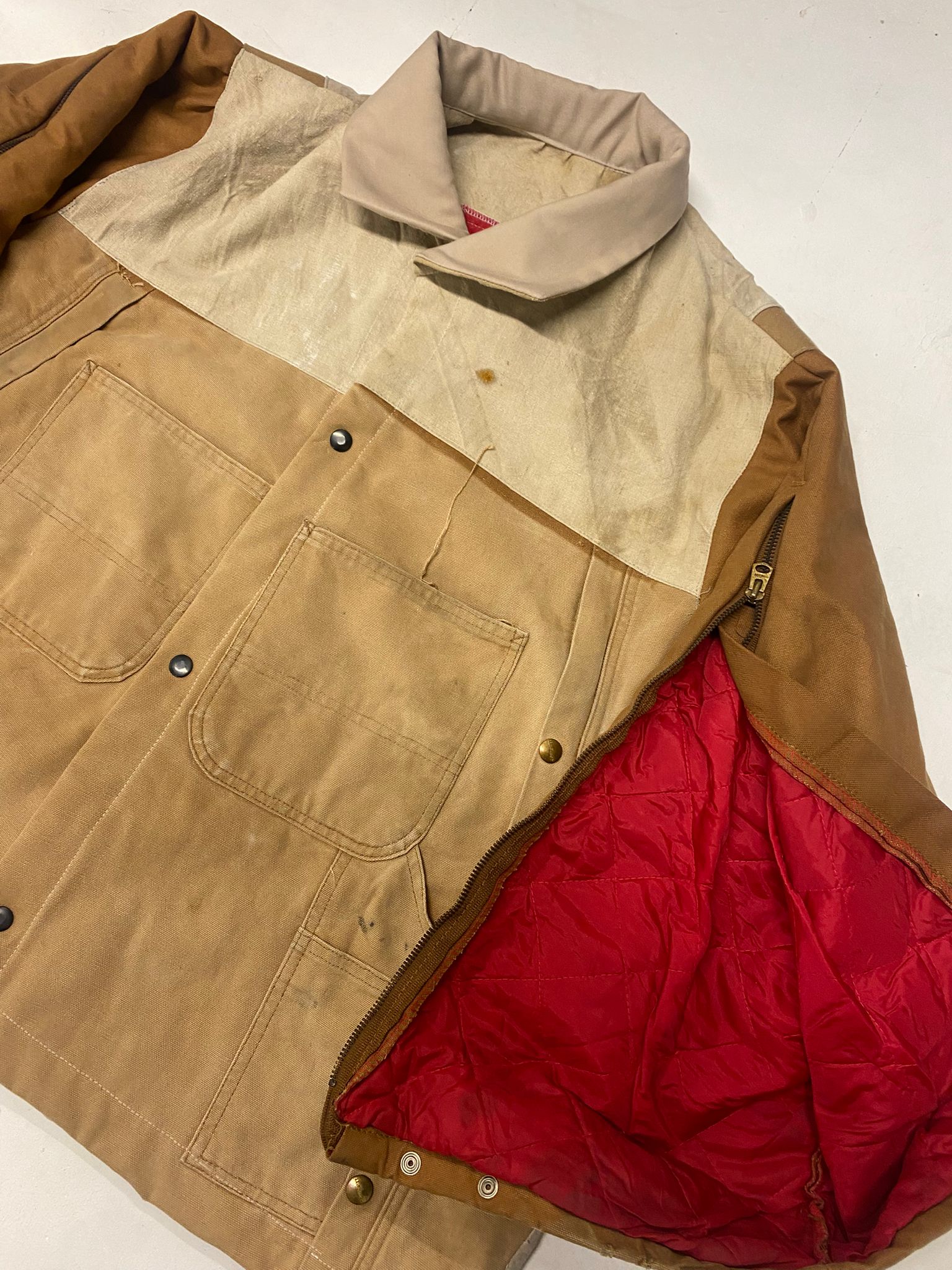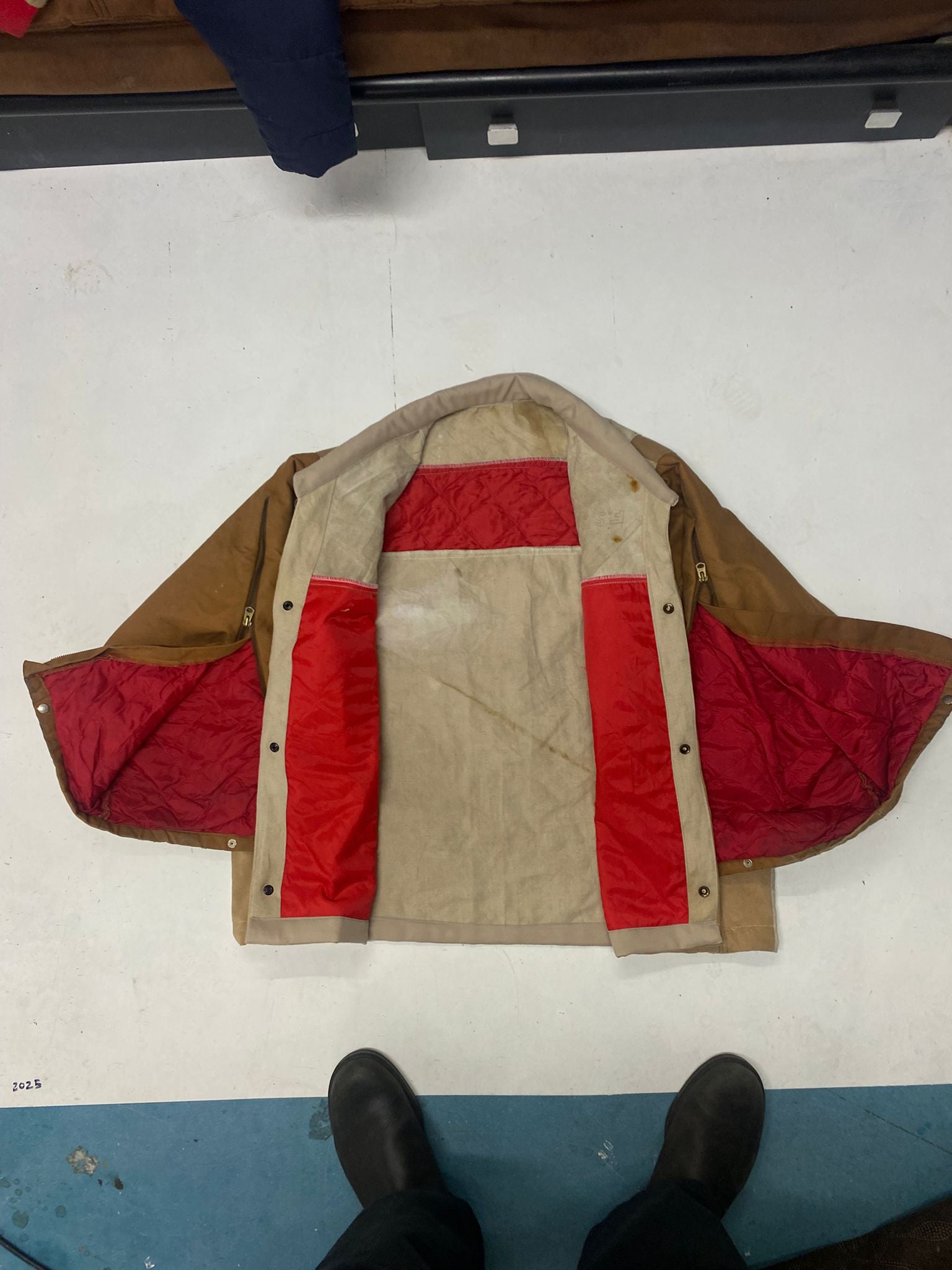One of a kind and hand sewn in our Bournemouth studio constructed from: 1950s canvas, reclaimed cotton twill, and 2 x vintage Carharrt red quilted lined canvas boiler suits