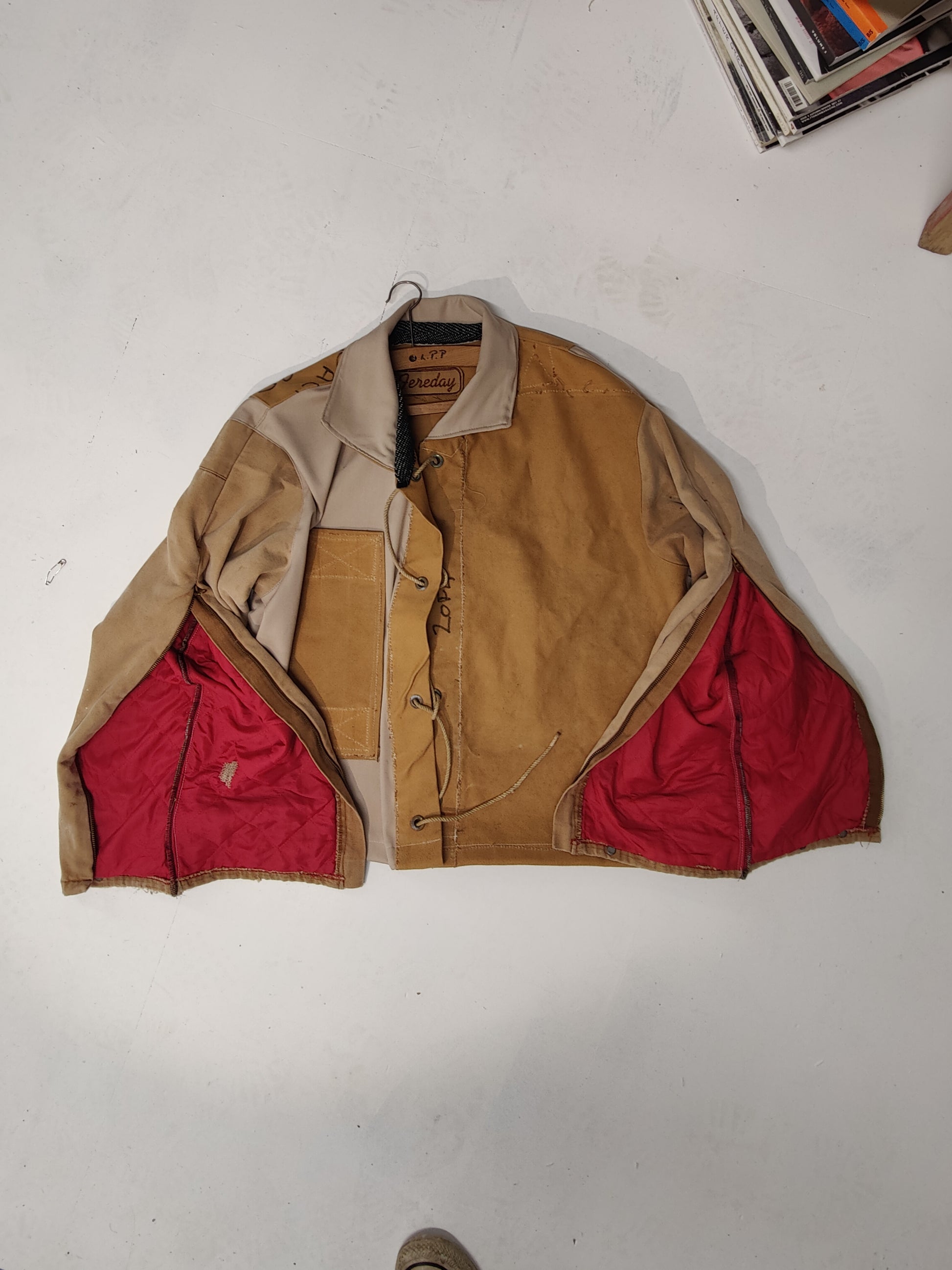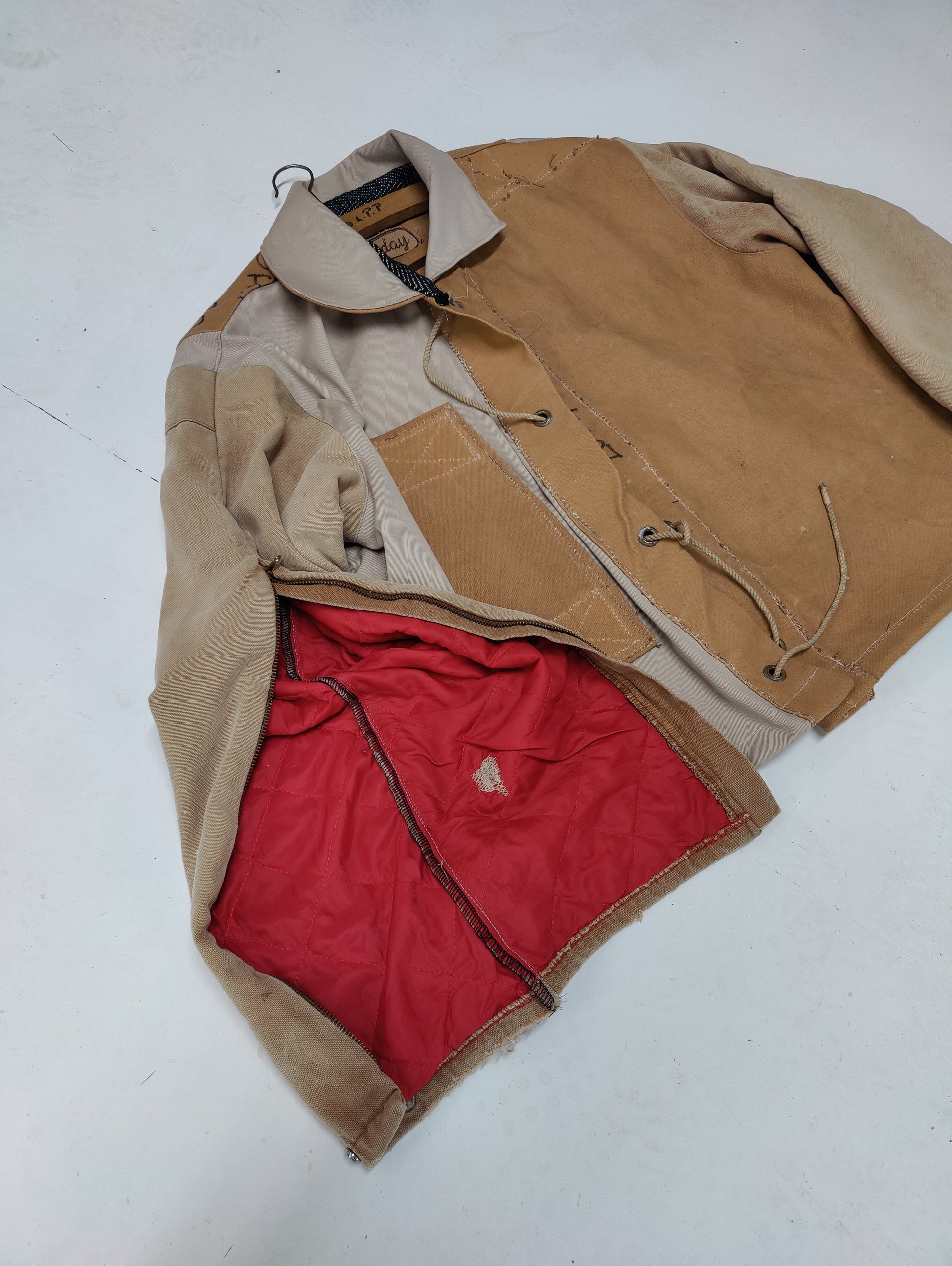One of a kind and hand sewn in our Bournemouth studio constructed from: 1950s canvas, reclaimed cotton twill, and vintage Carharrt red quilted canvas