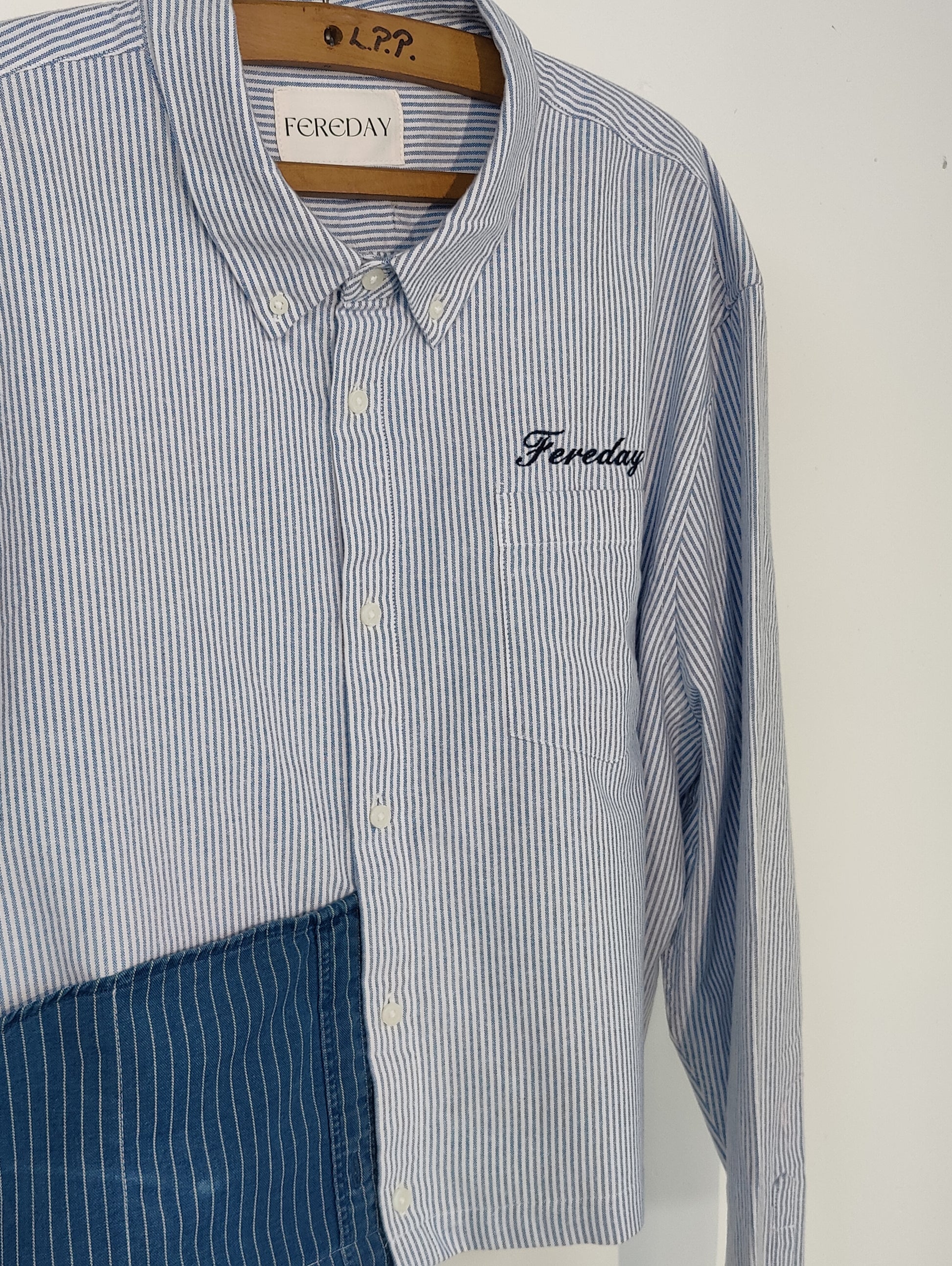 Button down shirt reworked in our studio to create this cropped body, drop shoulder, pocket front unique piece with tonal Fereday embroidery