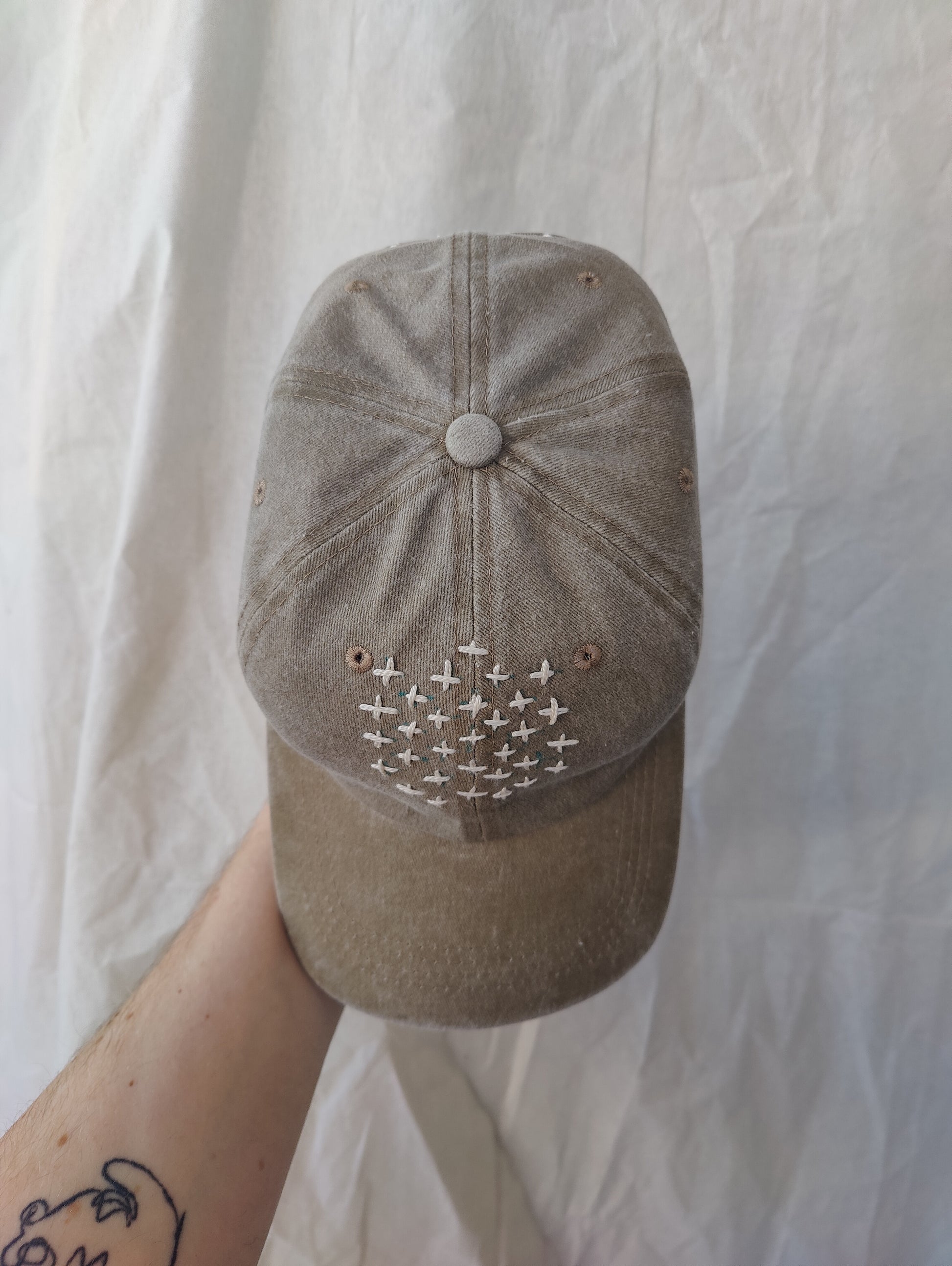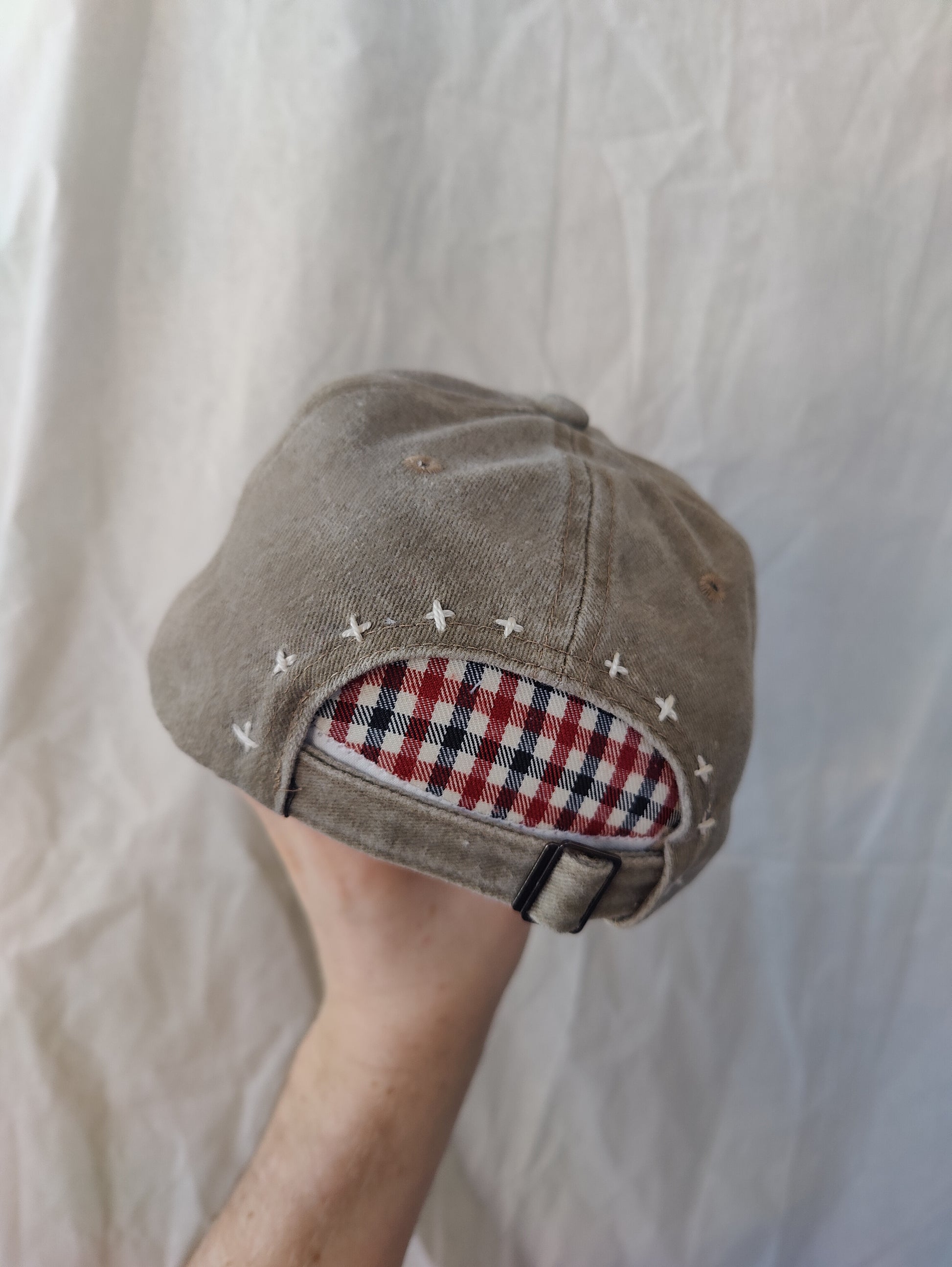 A cap with soul. This one-of-one Fereday piece blends deadstock 90s washed cotton with slow, meditative hand-stitching. Each cross mark is placed with care, inspired by centuries-old Japanese Sashiko techniques — not just to decorate, but to honour the act of repair and the stories clothing can carry.